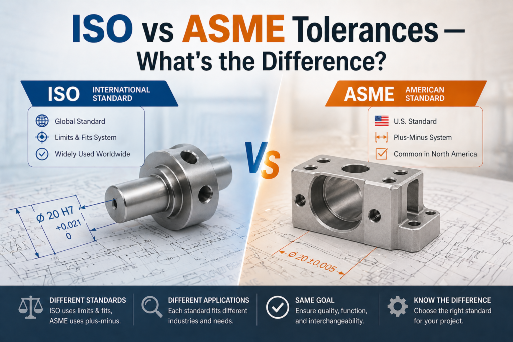 This guide explains the key differences between ISO and ASME tolerance standards, when each applies, and what you need to specify clearly when working across both systems.